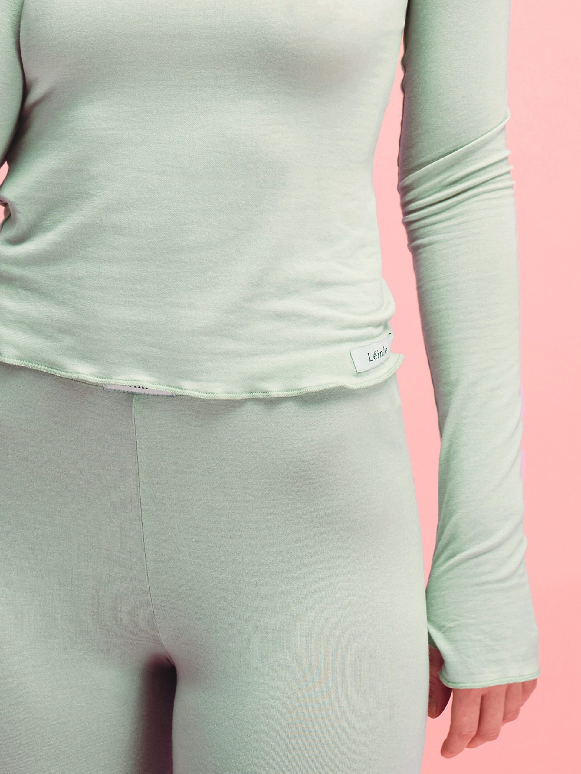 You won’t want to change out of it right away, because this sweater fits like a second skin. It’s the kind of garment that lets you go about your day comfortably, without a second thought about what you’re wearing. The silhouette is fitted and neat, with long sleeves and an interesting neckline that looks minimalist and beautifully accentuates the shoulders. The sleeves feature extended cuffs that are easy to pull up to shield your hands from the chill or, conversely, to expose your wrists depending on your mood. The hem, with its subtle finish, doesn’t make the silhouette look bulky; instead, it follows your movements and keeps the look neat. The light green shade is calm and neutral, so it pairs easily with everyday women’s clothing, loungewear, leggings, or even jeans. The modal in this model feels smooth to the touch and light as air; it holds its shape, breathes, wicks away moisture, and doesn’t cause unnecessary discomfort even on long days. This is a women’s basic garment made from natural fabric that’s comfortable to wear at home, take on trips, or layer under a shirt or jacket in the city. If you’re looking for minimalist women’s clothing that truly makes an impression when worn, you can order this long-sleeve top and buy it without hesitation. The fabric’s shade may vary slightly from the image due to photographic characteristics and color rendering on different devices.