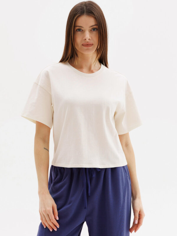 Universal everyday T-shirt in a modern design and fresh color palette: sky blue, classic off-white, vibrant lime, and elegant navy. Made from natural fabric, this shirt feels soft on the skin and ensures lasting comfort throughout the day.