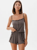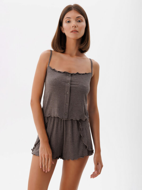 Women’s coffee-colored pajama with buttons and delicate ruffles