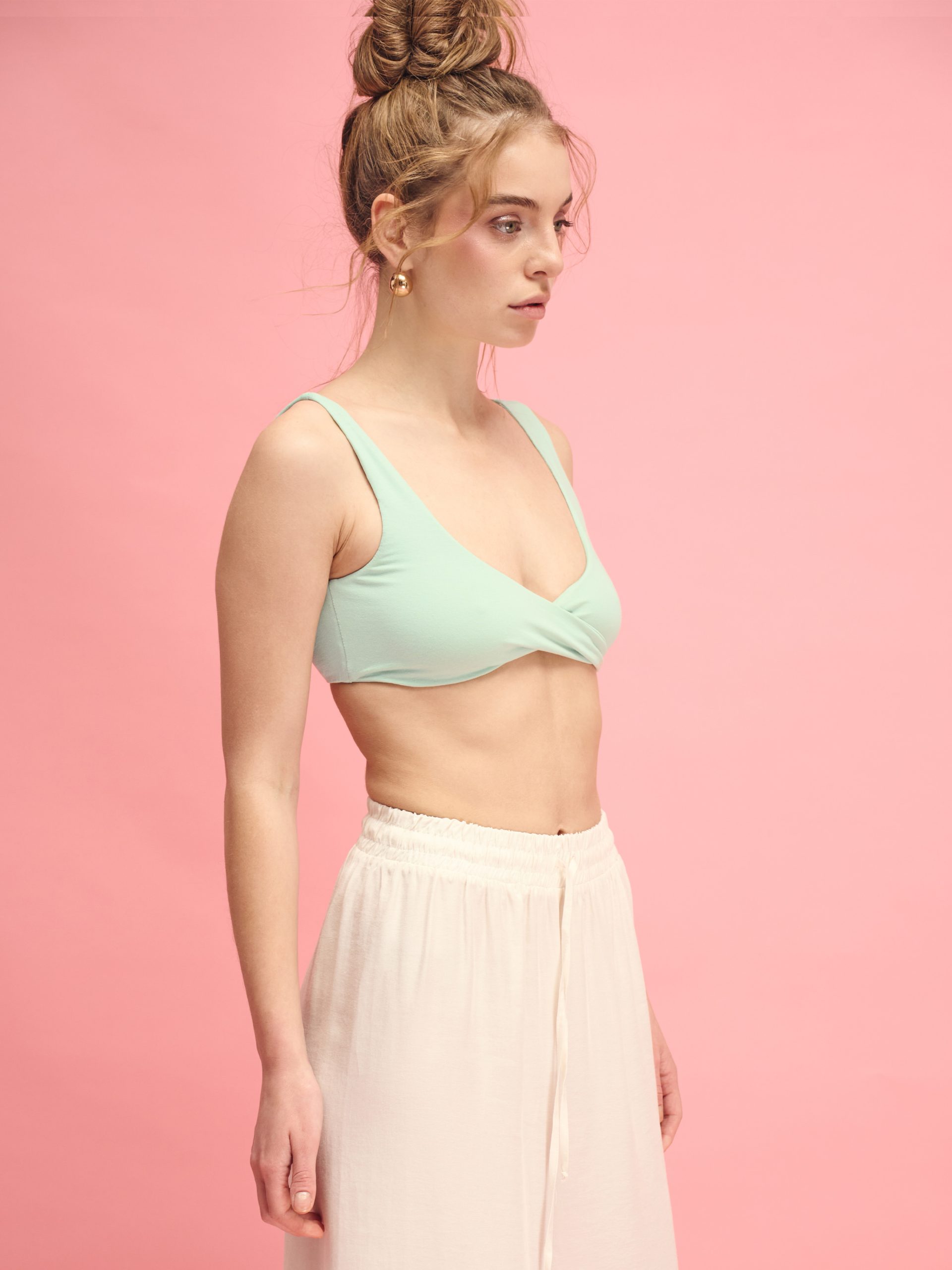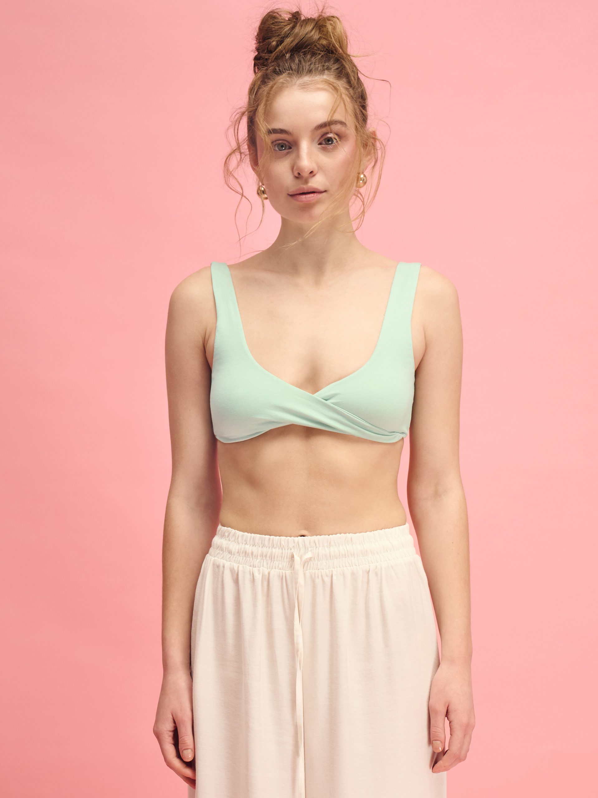 A top that feels like an essential addition to your wardrobe: nothing feels constricting, just comfort and a flattering silhouette. The fit is similar to a bra top: open shoulders, a V-neckline with a twisted “wrap” detail at the front. It provides gentle bust support and looks very put-together − both as a standalone statement piece and as a base layer under a hoodie, shirt, or cardigan. It works for lounging at home, for days out on the town, and as everyday women’s clothing in a sporty-casual style − when you want minimalist women’s clothing without any fuss. The top is available in three shades: heather gray, classic gray, and light green. Each color has its own vibe − from a subtle base to a fresh accent that adds lightness and naturalness to your look. The blend of modal and cotton with spandex creates a more natural, “cotton-like” feel when worn. The fabric is soft, breathable, and comfortable against the skin, while looking smooth and neat and retaining its shape even during activity. This women’s basic top is easy to incorporate into a loungewear outfit or pair with bottoms for a complete look. You’ll want to order one for yourself and buy it right away paired with bottoms from NUA for a complete, eye-catching look. The fabric’s shade may vary slightly from the image due to the characteristics of photography and color rendering on different devices.