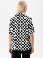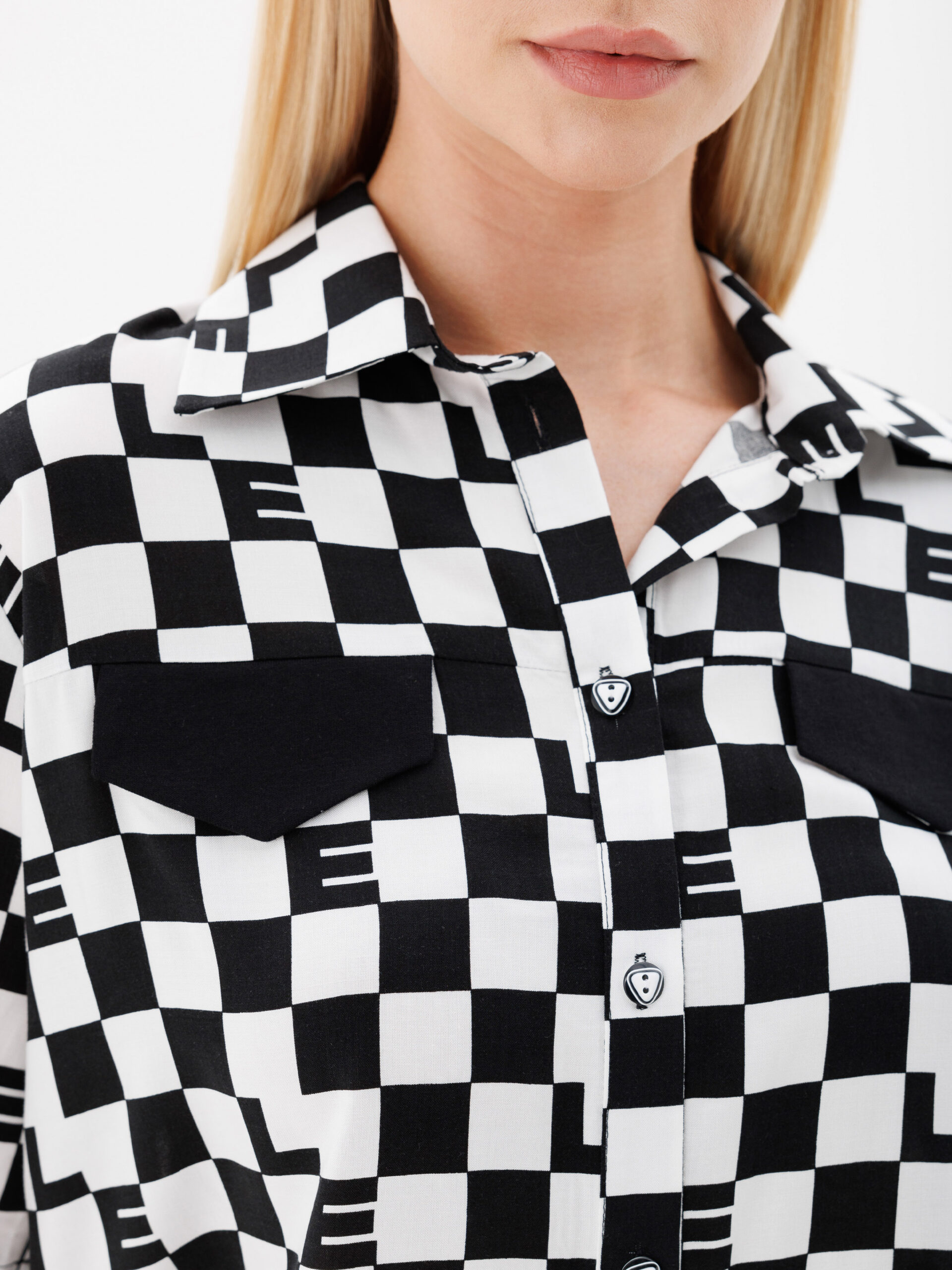Ця модель створена для тих, хто цінує сучасний дизайн та комфорт. Чорно-білий шаховий принт із геометричними елементами надає виробу сміливого та оригінального вигляду. Деталі: джемпер вільного крою з коротким рукавом, комір-сорочка, гудзики по всій довжині. Два накладні кишені додають функціональності та завершують дизайн. Матеріал: м’яка та легка тканина, що дозволяє шкірі дихати, ідеально підходить для повсякденного носіння. З чим поєднувати: чудово виглядає як з класичними брюками, так і з джинсами чи спідницею. Колекція Lex Oppia поєднує у собі мінімалізм та експериментальність, створюючи ідеальний баланс для сучасного гардероба. Обирайте цей джемпер для впевненого та стильного вигляду кожного дня!