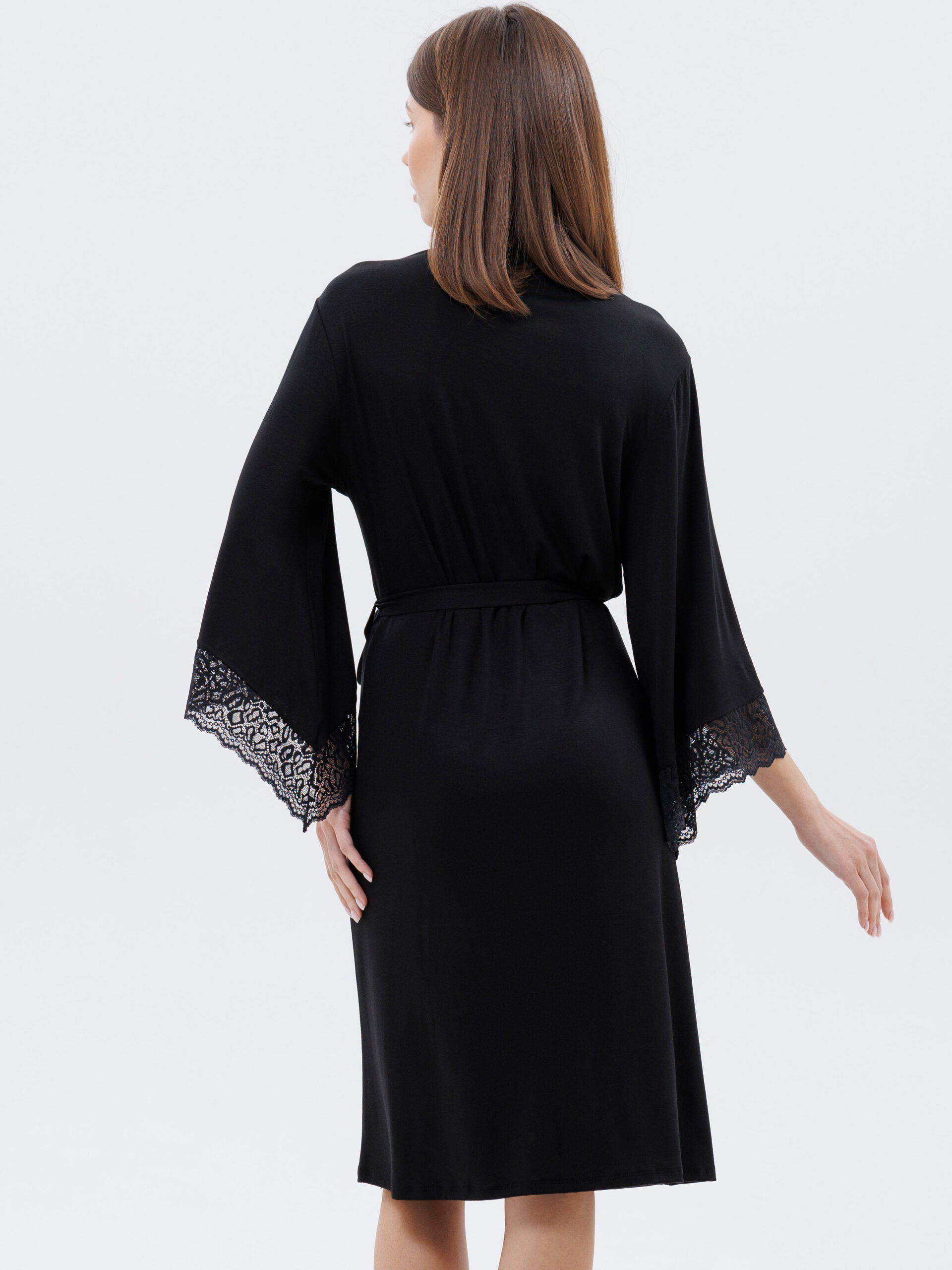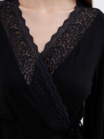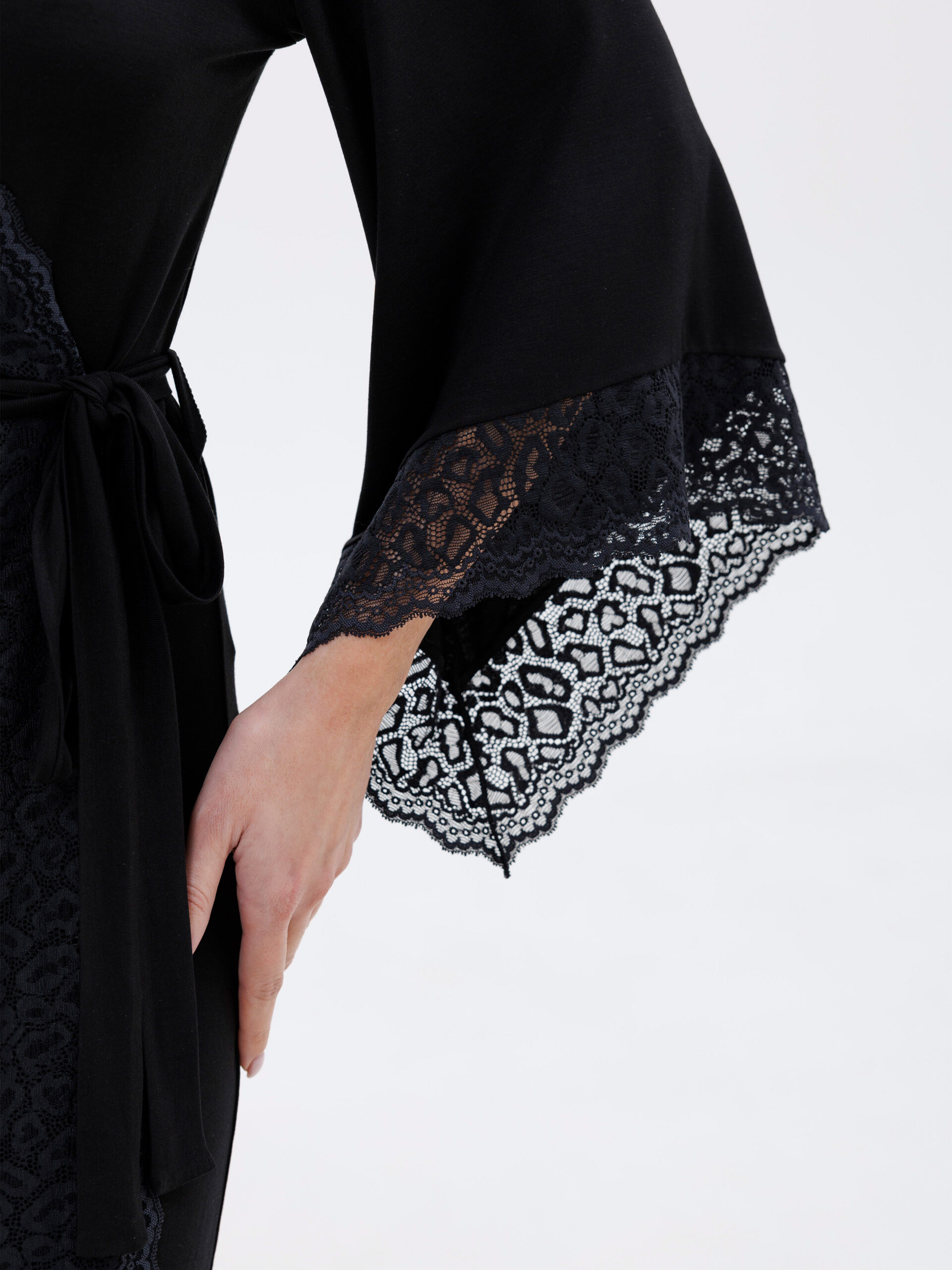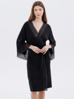 Чорний халат із м’якої віскози створений для тих, хто цінує комфорт і чуттєвість. Напівприлеглий силует м’яко огортає тіло, а витончене мереживо на вирізі та широких рукавах додає вишуканості. Легка еластичність тканини забезпечує зручність і природне прилягання. Ідеальний для домашнього релаксу, ранкової кави чи спокійного вечора. Стильний, ніжний, дихаючий – саме той халат, у якому відчуваєш себе впевнено вдома.
