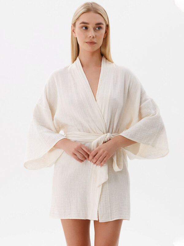 Жіночий халат з мусліну в стилі кімоно створений для того, щоб дарувати вам відчуття легкості та елегантності. Широкі, вільні рукави і запах додають вишуканості та комфортно огортають ваше тіло. Легкий і повітряний матеріал мусліну дозволяє шкірі дихати, створюючи приємний ефект прохолоди. Ідеально підходить для вечірніх ритуалів, прогулянок вдома чи як доповнення до розслабленого образу.