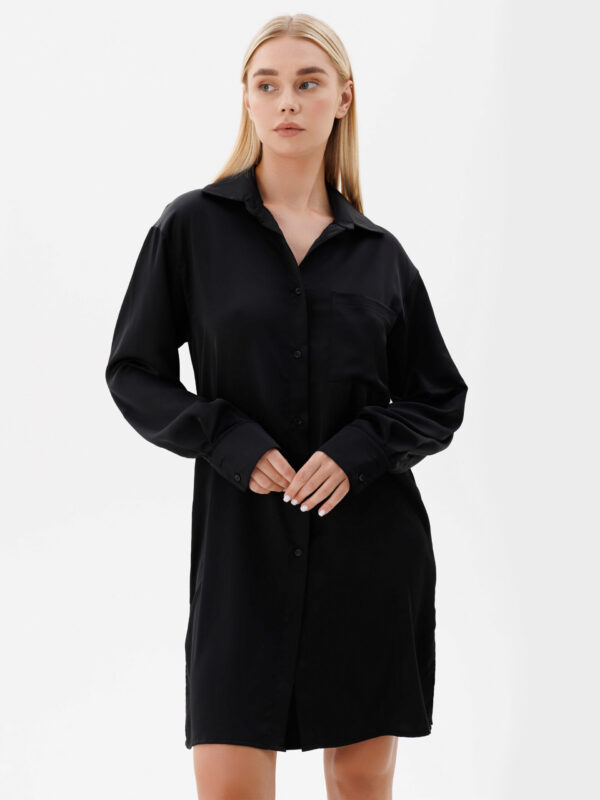 Халат чорного кольору з довгим рукавом та широким коміром. Приємний мікс поміж класикою та казуальністю. Цікавий вибір, якщо обожнюєте вільний фасон та класичні рубашки, та бажаєте додати цей стиль у свій повсякдней лук.