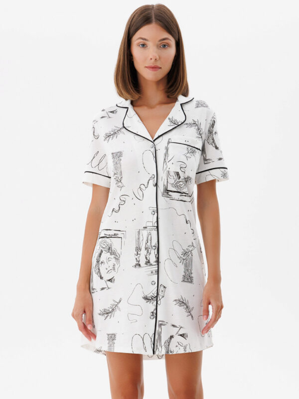 Халат у білому кольорі зі стильним лінійним принтом створений для тих, хто цінує поєднання естетики й комфорту в щоденних образах. Гладка тканина з модалу та бавовни приємно лягає на тіло, дарує м’якість і добре пропускає повітря. Модал забезпечує шовковисту делікатність, а бавовна додає природності та комфорту, завдяки чому халат ідеально підходить для будь-якої пори року та довго зберігає бездоглядний вигляд. Модель має класичний відкладний комір, короткі рукави та контрастний кантик, що підкреслює силует і додає виробу охайності. Прямий крій не сковує рухів, а застібка на ґудзики робить халат зручним у щоденному використанні. Білий фон із витонченими художніми ілюстраціями створює сучасний, легкий настрій і виглядає особливо елегантно. Це саме той варіант, який хочеться носити щодня, а знайти, купити та замовити його можна просто зараз у кілька кліків.