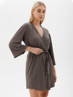 Особливості: Дизайн із запахом для регулювання посадки. Рукава ¾. М’яка тканина, приємна на дотик. Дизайн з рюшами. Мінімалістичний стиль із жіночним акцентом. Ідеальний вибір для ранкових ритуалів та вечірнього відпочинку.