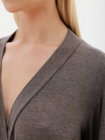 Затишний халат кавового кольору з поясом створений для вашого максимального комфорту. Легкий матеріал забезпечує свободу рухів і дарує відчуття легкості.