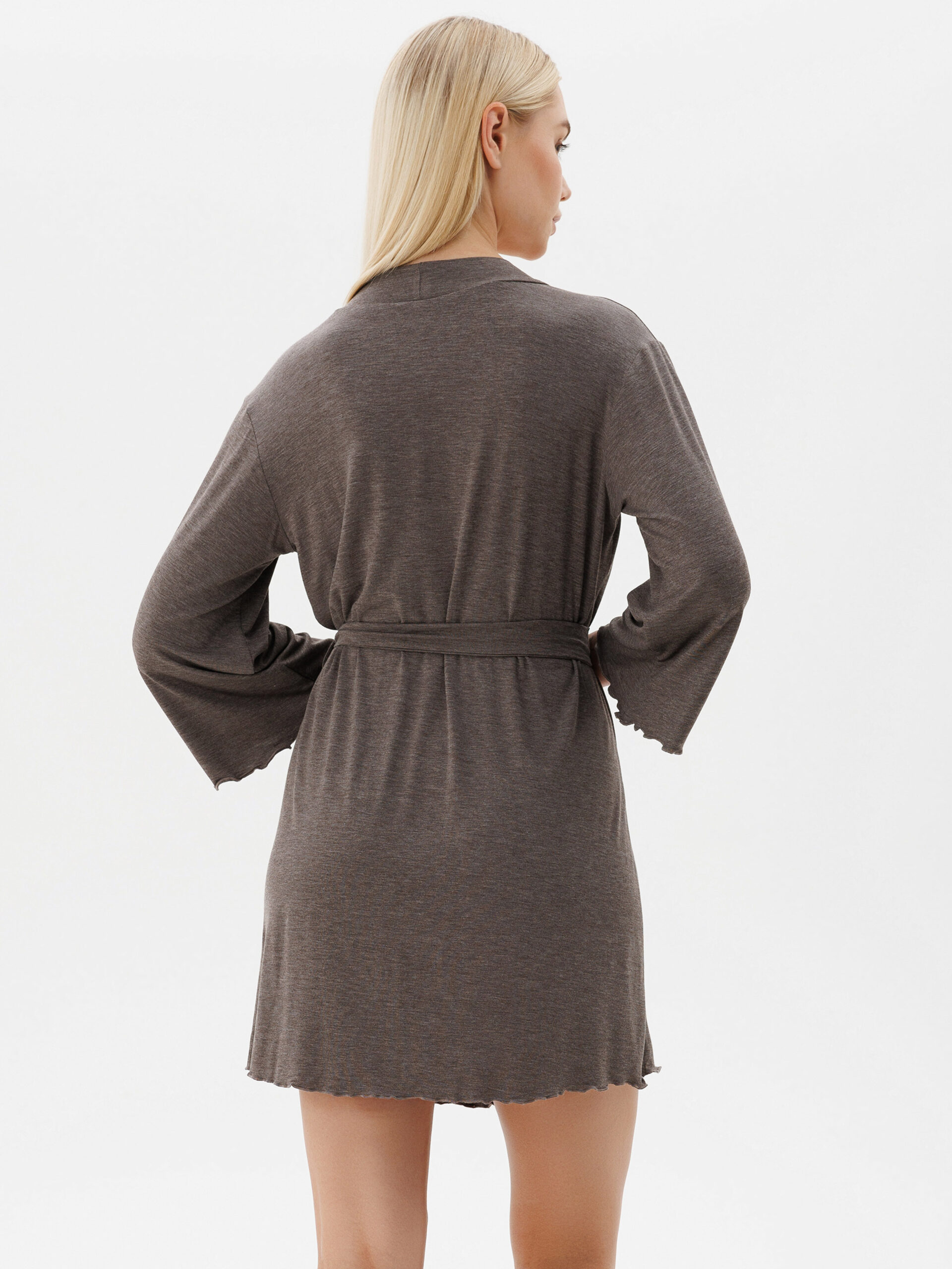 Затишний халат кавового кольору з поясом створений для вашого максимального комфорту. Легкий матеріал забезпечує свободу рухів і дарує відчуття легкості.