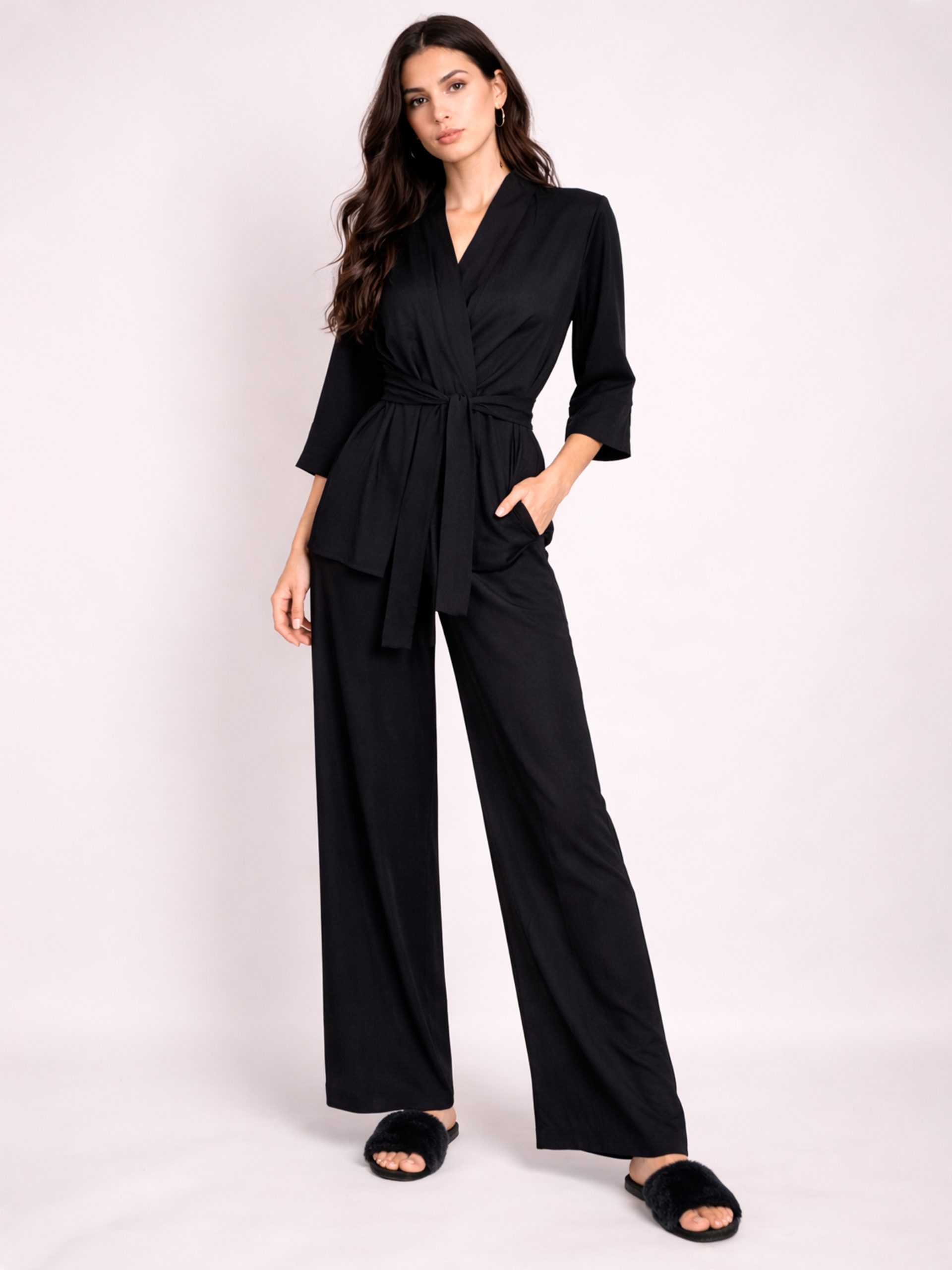 Домашній жіночий халат − втілення стриманої елегантності та продуманого комфорту для щоденного життя вдома. Лаконічний крій із запахом красиво підкреслює силует, формує охайну лінію талії та створює відчуття зібраності без зайвої строгості. Модель виглядає стильно й доречно у будь-який момент − зранку за кавою, під час домашніх справ або у вечірньому спокої. М’яка віскоза приємна до тіла тканина ніжно лягає, не обтяжує рухи та дарує комфорт протягом усього дня. Рукави довжиною 3/4 додають практичності, а пояс дозволяє регулювати посадку під фігуру. Глибокий чорний колір робить халат універсальним і позачасовим − він легко поєднується з піжамами, нічними сорочками або домашніми комплектами. Цей домашній халат створений для жінок, які цінують баланс між красою та зручністю, хочуть відчувати впевненість у кожному русі. Вдалий вибір для власного гардероба або стильного подарунка. Чорний халат з віскози легко замовити та купити для комфортного й естетичного домашнього образу щодня.