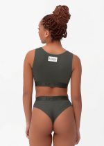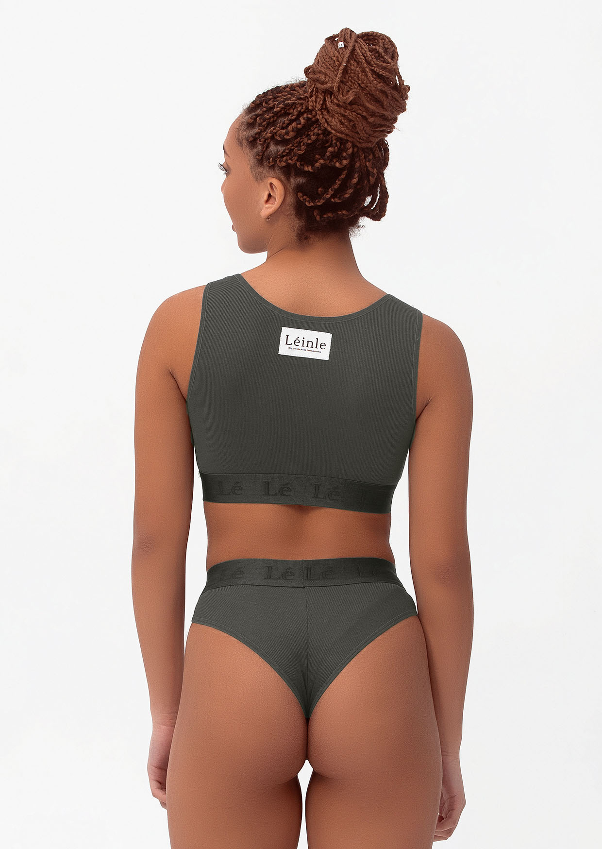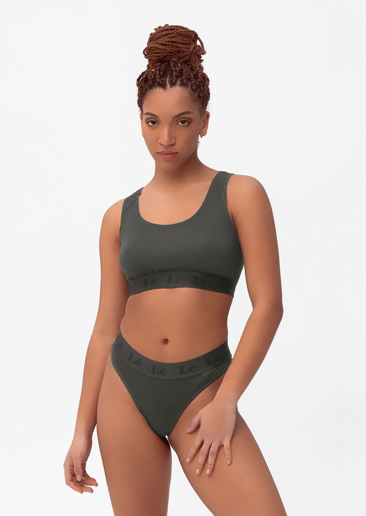 Темно-зелений комплект білизни створений для щоденного комфорту та природної легкості. М’яка віскозна тканина з еластаном приємно торкається шкіри, дарує гладкість і еластичність, завдяки якій рухи залишаються вільними та невимушеними. Топ має зручний крій з широкими бретелями, що забезпечують делікатну підтримку без тиску та жорстких елементів. Він комфортно сидить на тілі, підлаштовується під силует і залишається зручним як під час активного дня, так і в моменти відпочинку. Бразиліани з високою посадкою плавно повторюють лінії тіла, підкреслюють талію та створюють відчуття м’якості завдяки еластичному поясу з логотипом Lé. Тканина тягнеться у потрібних напрямках, не сковує та залишається майже непомітною під одягом. Модель ідеально підходить для щоденного носіння, легких фізичних активностей або як базовий комплект для дому. Темно-зелений відтінок надає образу глибини, спокою й природної гармонії. Це колір, який легко поєднується з іншими речами та створює відчуття впевненості. Комплект білизни стане улюбленим супутником у щоденних ритуалах турботи про себе, а зробити його своїм легко − його можна замовити та купити у кілька приємних кроків.