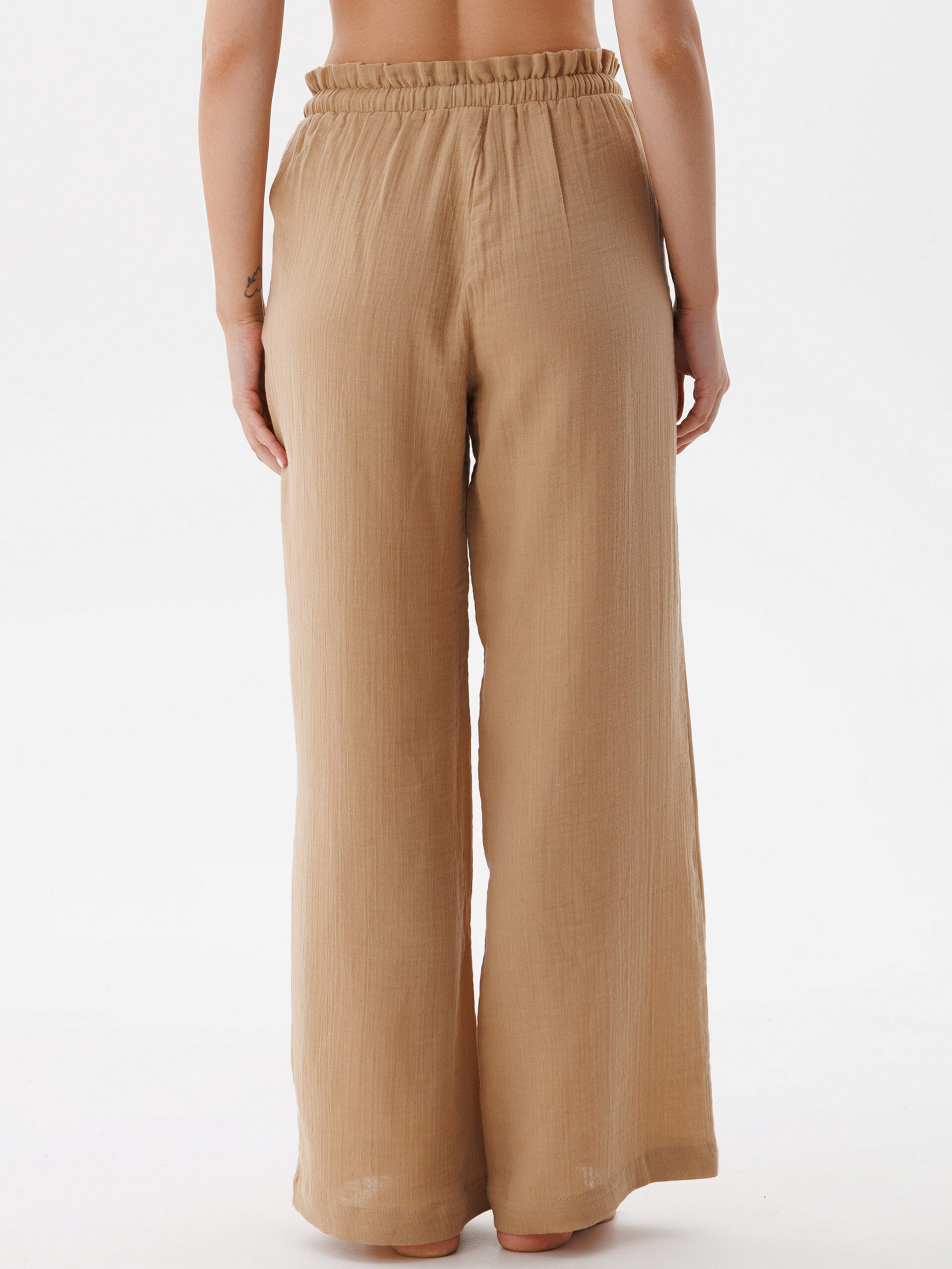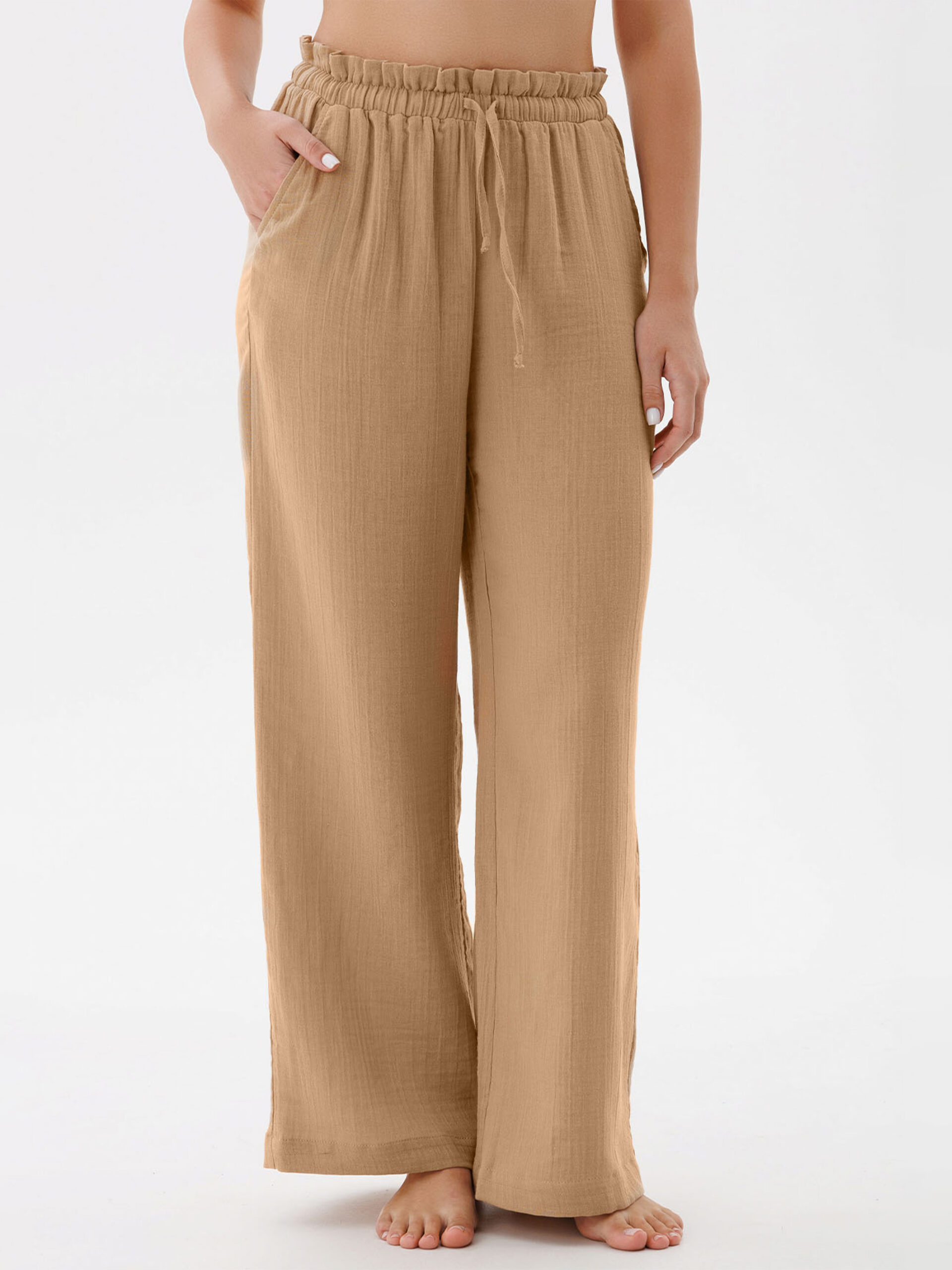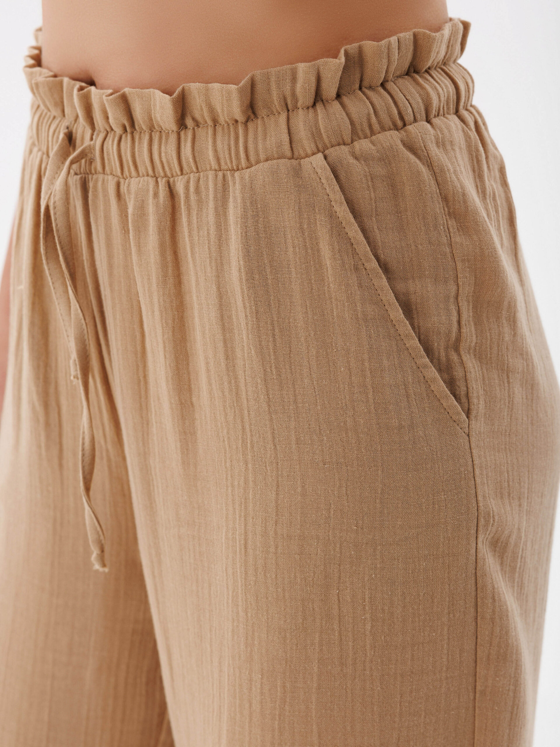 Жіночі штани з мусліну вільного рівного крою — ідеальний вибір для комфортного і стильного образу. Легкий і дихаючий матеріал забезпечує чудову вентиляцію, а вільний крій дарує свободу рухів. Шнурок на поясі дозволяє регулювати посадку штанів, підкреслюючи талію. Практичні бокові кармани додають зручності та функціональності, роблячи ці штани незамінними для повсякденних образів.