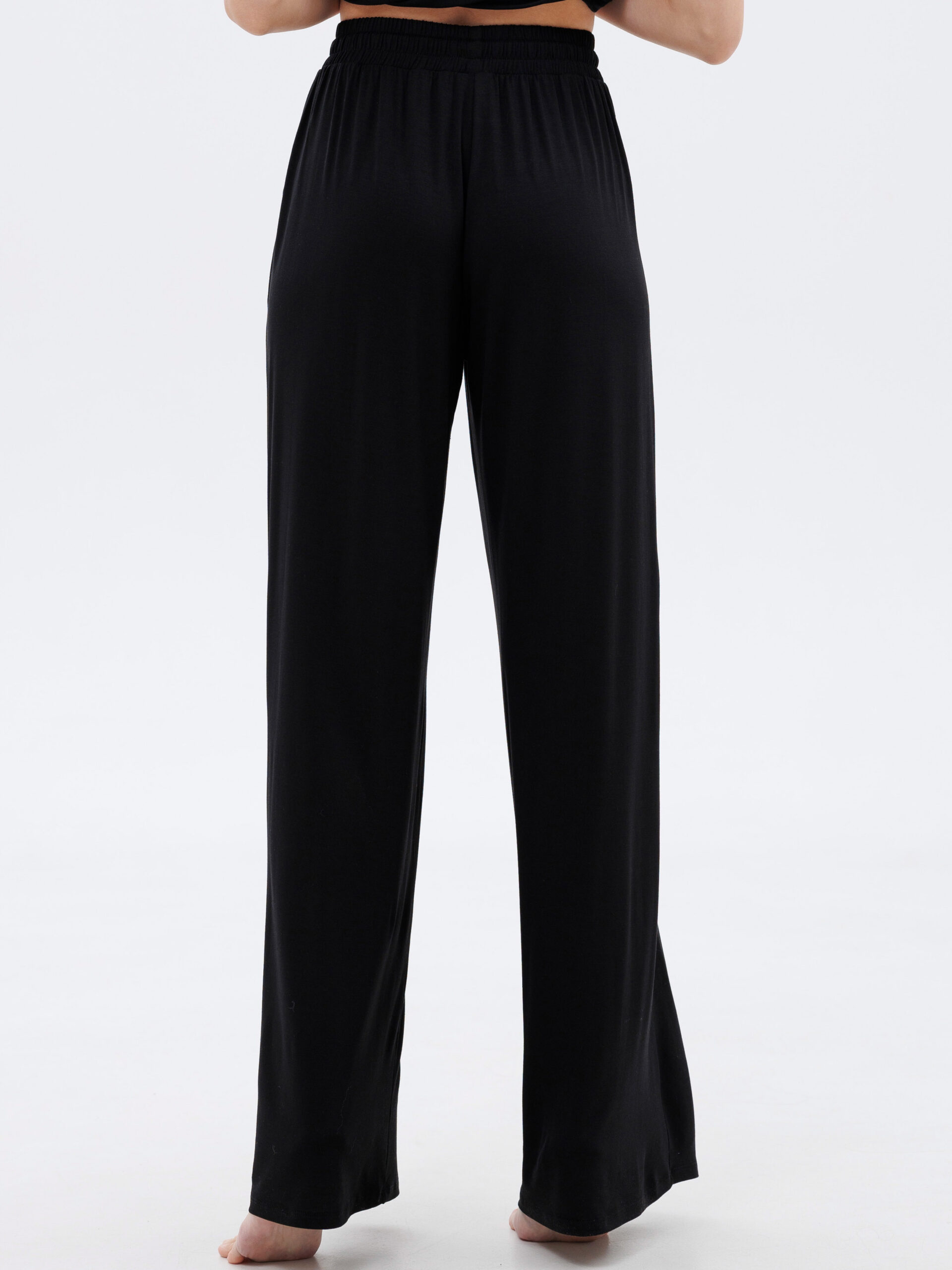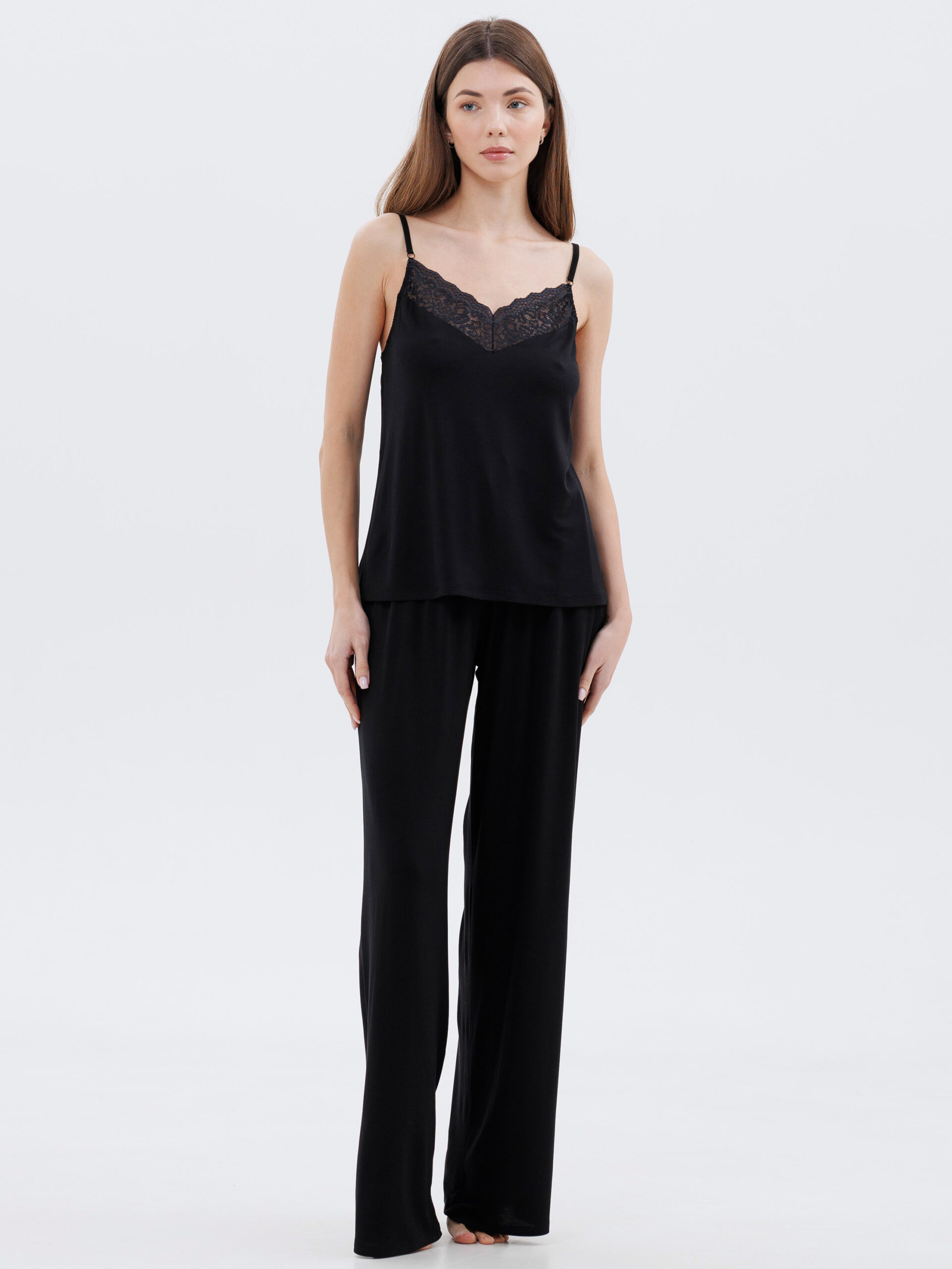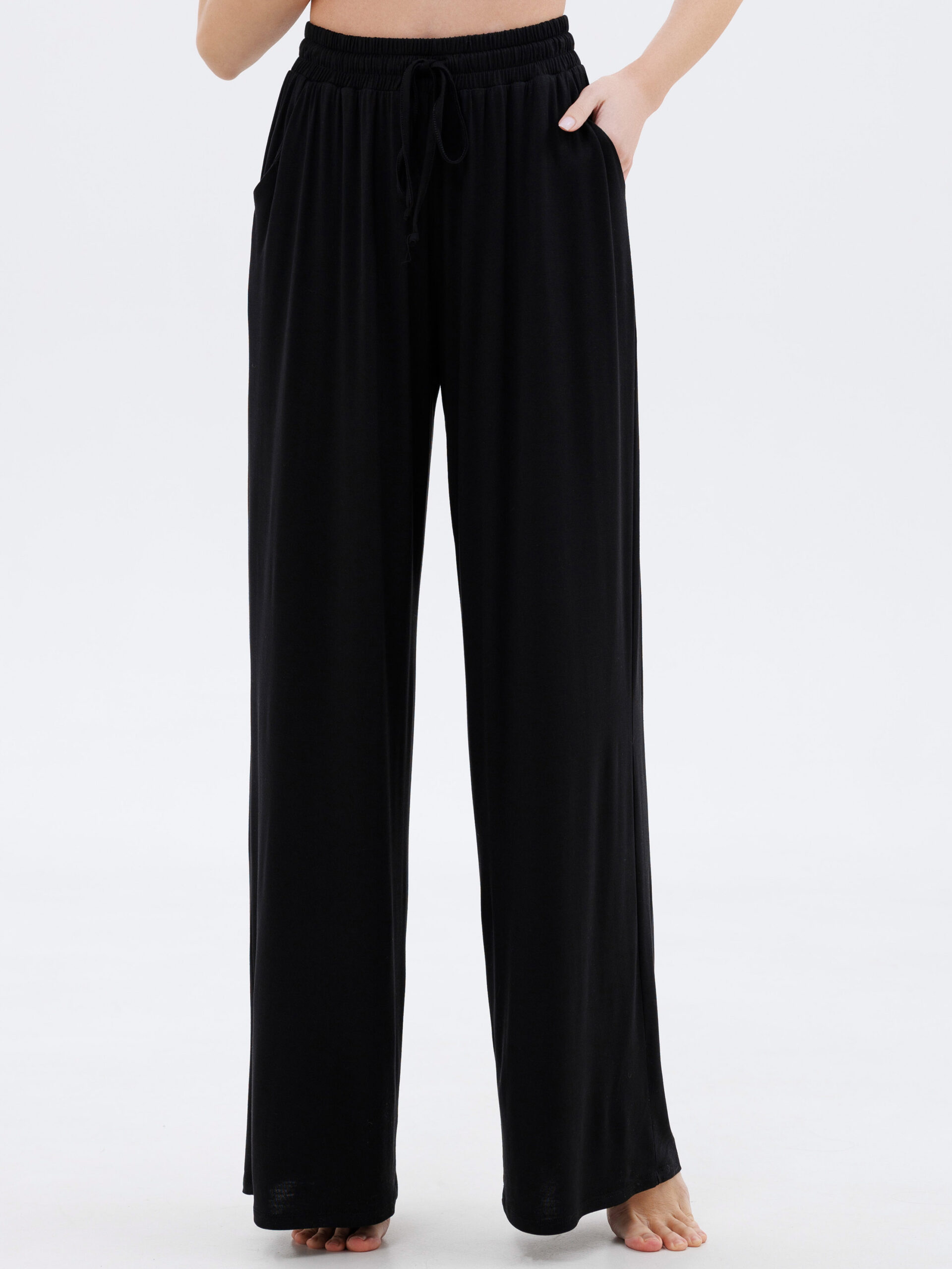 Ці жіночі невагомі штани подарують комфорт і легкість вдома. Широкі прямі штанини вільно спадають від стегна до низу, забезпечуючи дихаючий ефект і свободу рухів. Застібка-поводок на поясі та місткі бокові кишені додають практичності, а глибокий чорний колір робить образ завершеним. Ідеально поєднуються з будь-якою майкою чи халатом із колекції Amour.