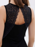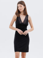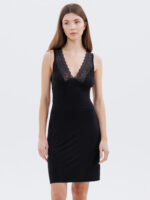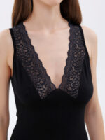Ця витончена чорна нічна сорочка об’єднує ніжність віскози з еластичністю лайкри. Силует м’яко огортає фігуру, а широкі бретелі й мереживна вставка по декольте створюють спокусливий акцент. Тканина дихає, не сковує рухів і дарує відчуття легкості у кожному русі. Ідеальний вибір для домашнього релаксу, спокійного вечора чи ранкового відпочинку.