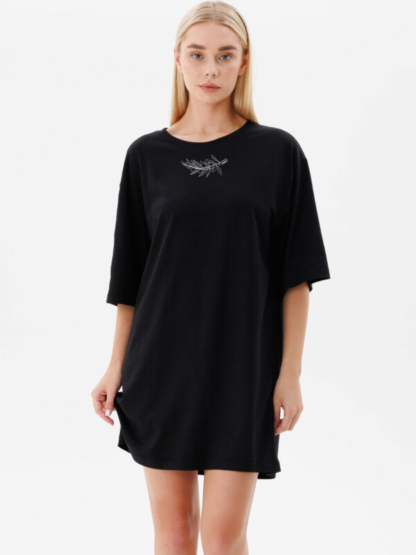 Сукня у чорному кольорі створена для максимального комфорту та невимушеного стилю. М’яка тканина з модалу та бавовни приємно торкається шкіри, забезпечує легкість, повітропроникність і природну еластичність. Модал додає виробу шовковистої гладкост, а бавовна – відчуття натуральності та комфорту протягом усього дня. Завдяки цьому поєднанню сукня зберігає форму, не перевантажує силует і залишається комфортною незалежно від сезону. Модель має вільний крій, який забезпечує свободу рухів і створює актуальний relaxed-силует. Подовжений рукав додає легкості та сучасності, а мінімалістична вишивка на грудях робить образ лаконічним, але водночас стильним. Чорний колір універсальний і пасує як для домашнього затишку, так і для casual-виходів. Це сукня, яку хочеться носити щодня, купити та замовити її можна просто зараз у кілька кліків.