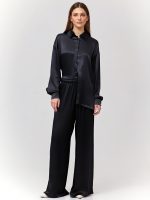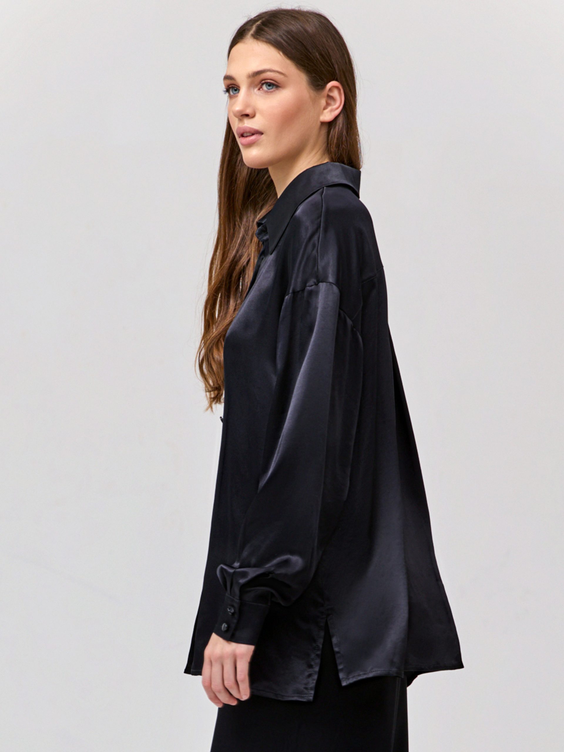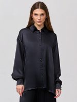 Женская «загадочная» черная блуза на пуговицах из коллекции «ШЕПИТ» — это о спокойном ритме дня, когда одежда не отвлекает, а мягко поддерживает твое видение мира. Прямой крой со спущенным плечом формирует плавный силуэт, удлиненный низ красиво ложится поверх брюк или шорт, а классический воротник и аккуратная планка на пуговицах добавляют образу сдержанных классических нот. Глубокий черный цвет выглядит благородно и универсально, без усилий − интеграция в базовый гардероб и сочетание со многими оттенками. Ткань − вискоза, гладкая и мягкая, с шелковым блеском. Она дышит, дарит ощущение прохлады и свободы движений, поэтому эта черная женская блуза комфортна как дома, так и во время прогулок, поездок, встреч в городе. Достаточно добавить аксессуары – и у вас уже есть уникальный стильный черный комплект. Выберите свой размер и позвольте себе эту легкость: блузу можно купить и заказать онлайн.