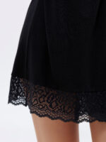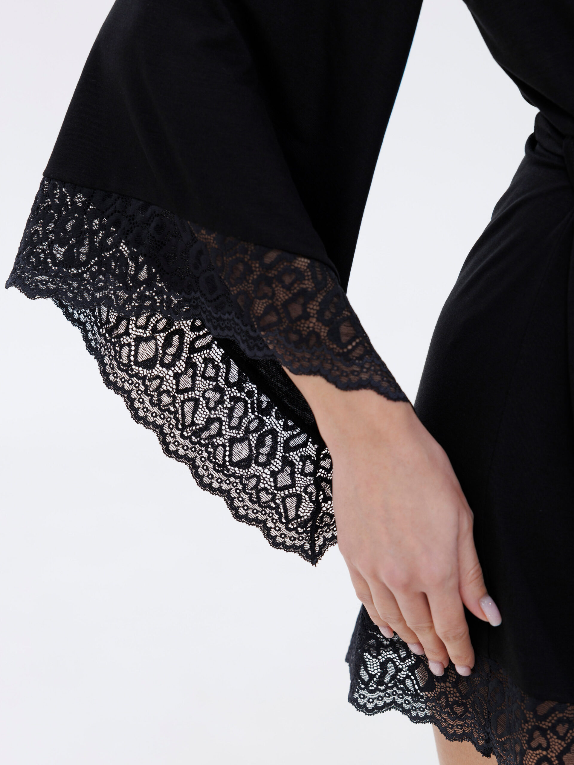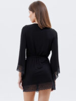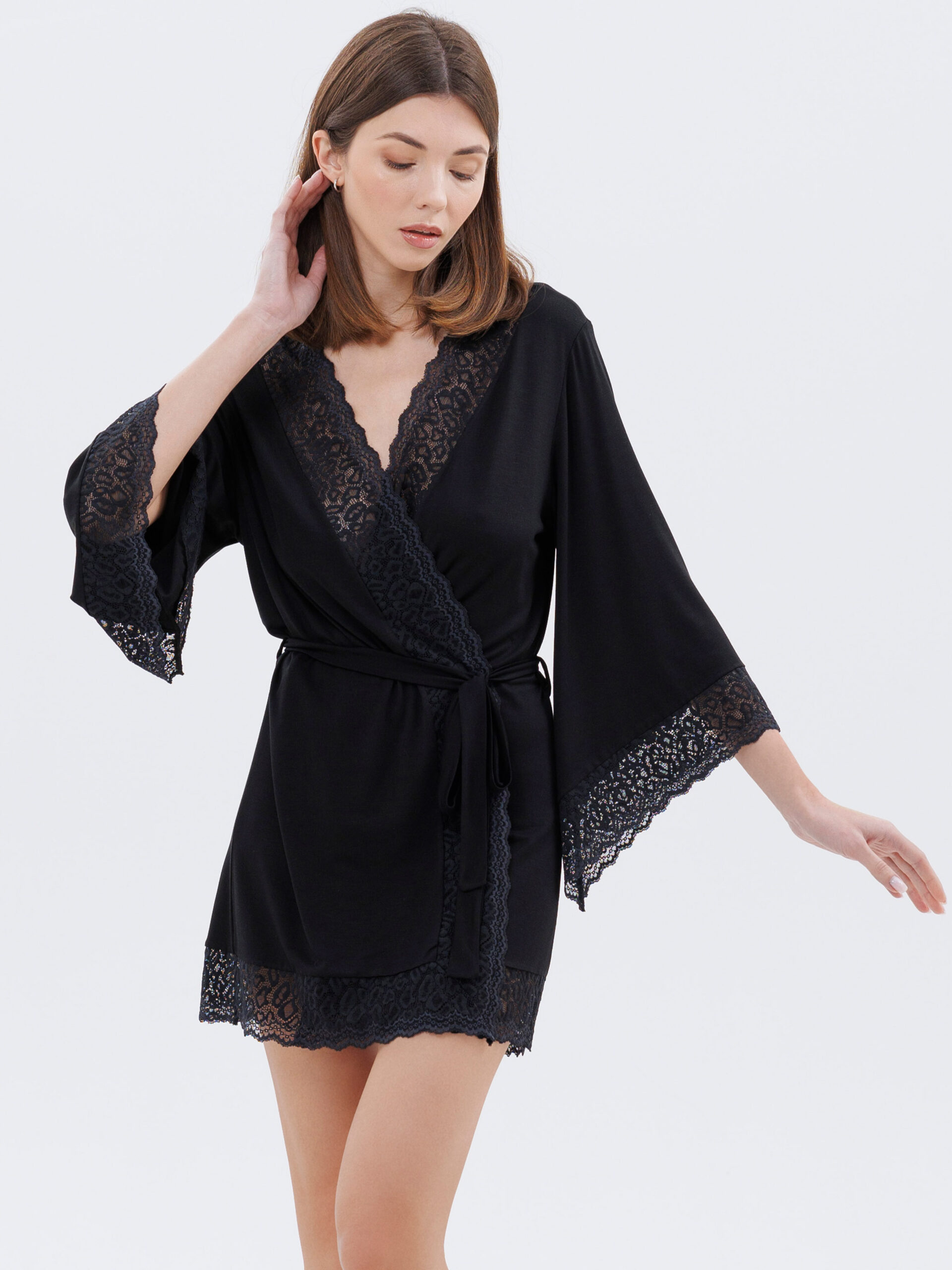 Этот короткий черный халат – настоящая находка утонченного домашнего стиля. Легкая вискоза с добавлением эластана мягко окутывает тело, создавая приятное чувство комфорта. Широкие рукава, глубокий вырез и кружевная обработка по краям придают образу чувственности. Завязывается на пояс, подчеркивающий талию. Идеален для вечернего отдыха или неспешного утра.