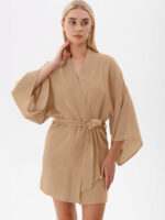 Этот женский халат из муслина, исполненный в стиле кимоно, подарит вам максимальный комфорт и элегантность. Его широкие, свободные рукава придают легкость и изящество, а запах подчеркивает естественную женственность, позволяя регулировать посадку для идеальной фигуры. Мягкая и дышащая ткань муслина дарит ощущение прохлады и комфорта даже в самые жаркие дни. Идеальный выбор для вечерних расслабленных моментов или для того, чтобы добавить нотку роскоши к домашнему образу.