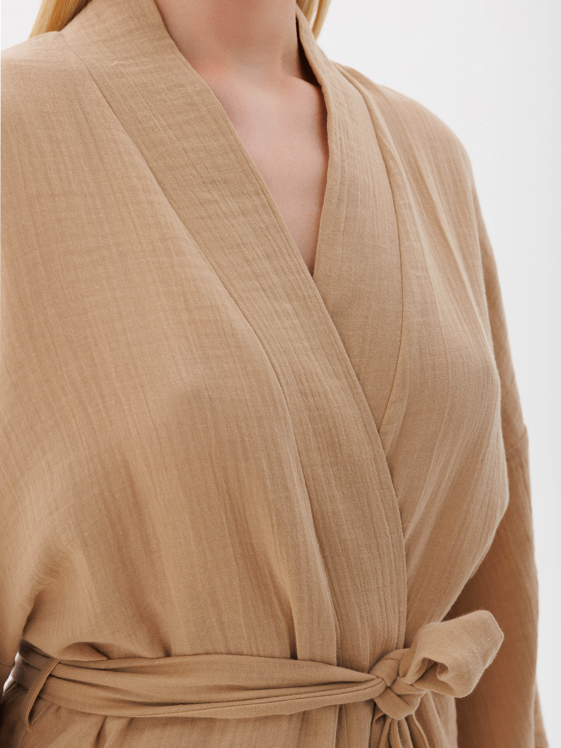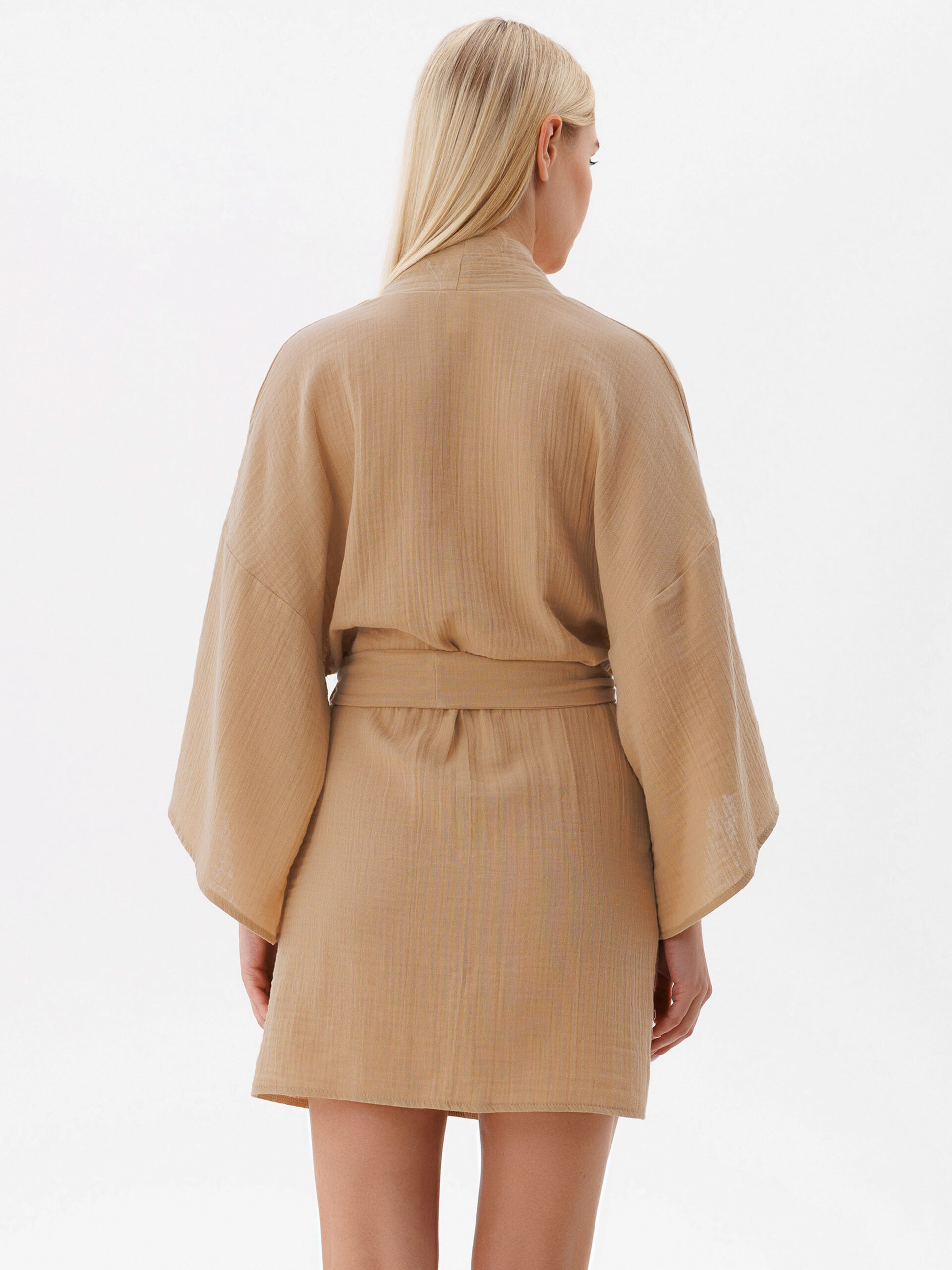 Этот женский халат из муслина, исполненный в стиле кимоно, подарит вам максимальный комфорт и элегантность. Его широкие, свободные рукава придают легкость и изящество, а запах подчеркивает естественную женственность, позволяя регулировать посадку для идеальной фигуры. Мягкая и дышащая ткань муслина дарит ощущение прохлады и комфорта даже в самые жаркие дни. Идеальный выбор для вечерних расслабленных моментов или для того, чтобы добавить нотку роскоши к домашнему образу.