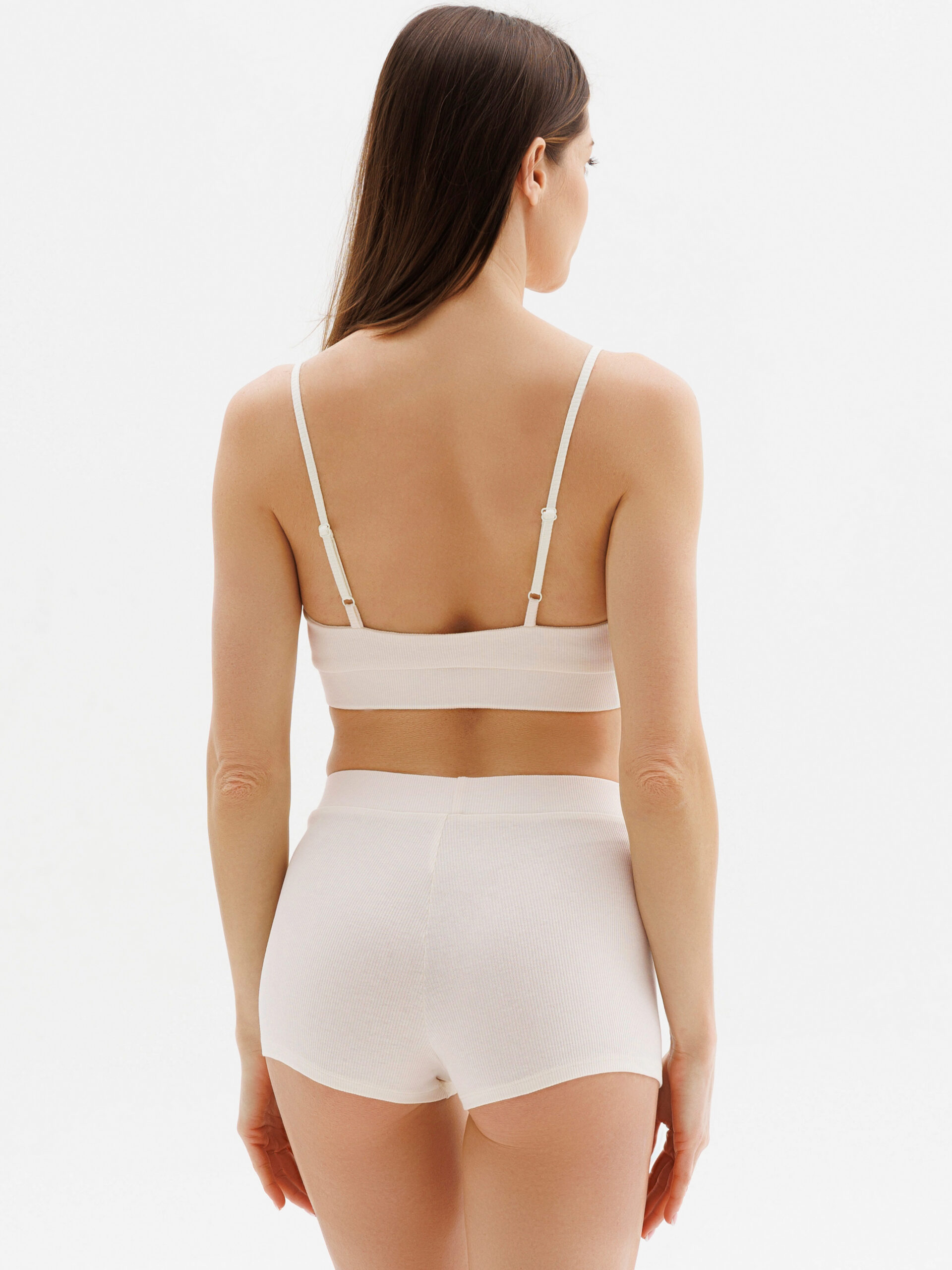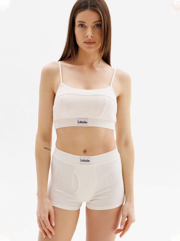 Комплект состоит из мягкого топа на тонких бретелях с удобной посадкой и высоких трусиков-шорт, нежно подчеркивающих фигуру.