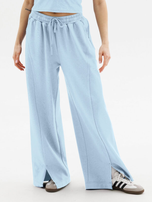 Голубой цвет подчеркивает элегантность модели и легко сочетается с базовыми футболками, топами и спортивным бра. Благодаря удобной резинке и регулируемому шнурку на талии брюки максимально комфортны и универсальны – правильный выбор для ежедневного использования дома, прогулок и активного образа жизни.