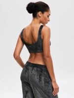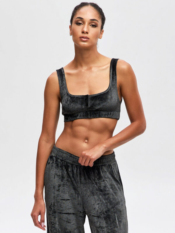 Лаконичный мини-кроп-топ с планкой спереди — маленький акцент, который делает образ выразительным. Шелковистая поверхность велюра мягко ложится на тело и придает благородную глубину цвета. Это комфортный топ из велюра темно-серого оттенка, который легко вписывается в ритм дня и не требует усилий в стилизации. Благодаря вискозе в составе велюр обладает легкостью, эластичностью и устойчивым видом при ежедневном использовании. Слегка квадратный передний вырез, глубокая U-образная спинка, широкие бретели для деликатной поддержки. Подгрудная обшивка фиксирует посадку без жестких элементов. Длина до линии ребер идеально сочетается с брюками, шортами, а если носить дома с халатом – создает завершенный сет. Топ для ежедневного образа интересный и минималистичный: женская одежда из мягкой ткани, которая выглядит уместно и днем, и вечером. Выберите размер и заказывайте стильную одежду из велюра на каждый день!